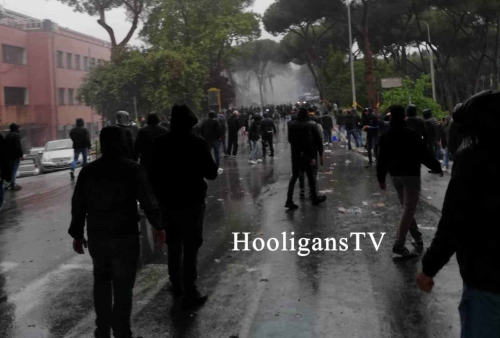 Λίγο πριν την είσοδό τους στο γήπεδο, οι “σκληροπυρηνικοί” οπαδοί των Ρωμαίων συγκρούστηκαν με δυνάμεις της αστυνομίας. Το.. μενού είχε βόμβες μολότοφ και πέτρες.
