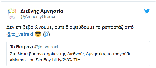 Το συγκεκριμένο ποστ φαίνεται πως είδαν οι υπεύθυνοι των social media της Διεθνούς Αμνηστίας. Έκαναν λοιπόν repost το κείμενο συνοδεύοντάς το με το σχόλιο: «Δεν επιβεβαιώνουμε, ούτε διαψεύδουμε το ρεπορτάζ από @to_vatraxi».