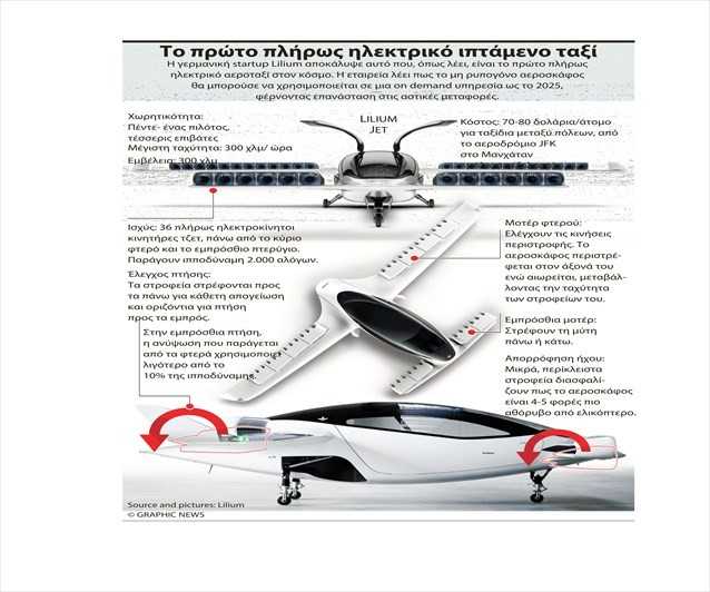 Η Lilium, μια startup που εδρεύει στο Μόναχο, με αντικείμενο on-demand υπηρεσίες αεροταξί, αποκάλυψε την Πέμπτη το πρωτότυπο του πενταθέσιου ιπτάμενου ταξί της για πρώτη φορά. Όπως υπογραμμίζει σε ανακοίνωσή της η εταιρεία, η παρουσίαση του Lilium Jet έγινε αφού είχε προηγηθεί η παρθενική πτήση του ηλεκτρικού αεροσκάφους στους ουρανούς της Γερμανίας νωρίτερα μέσα στον μήνα.