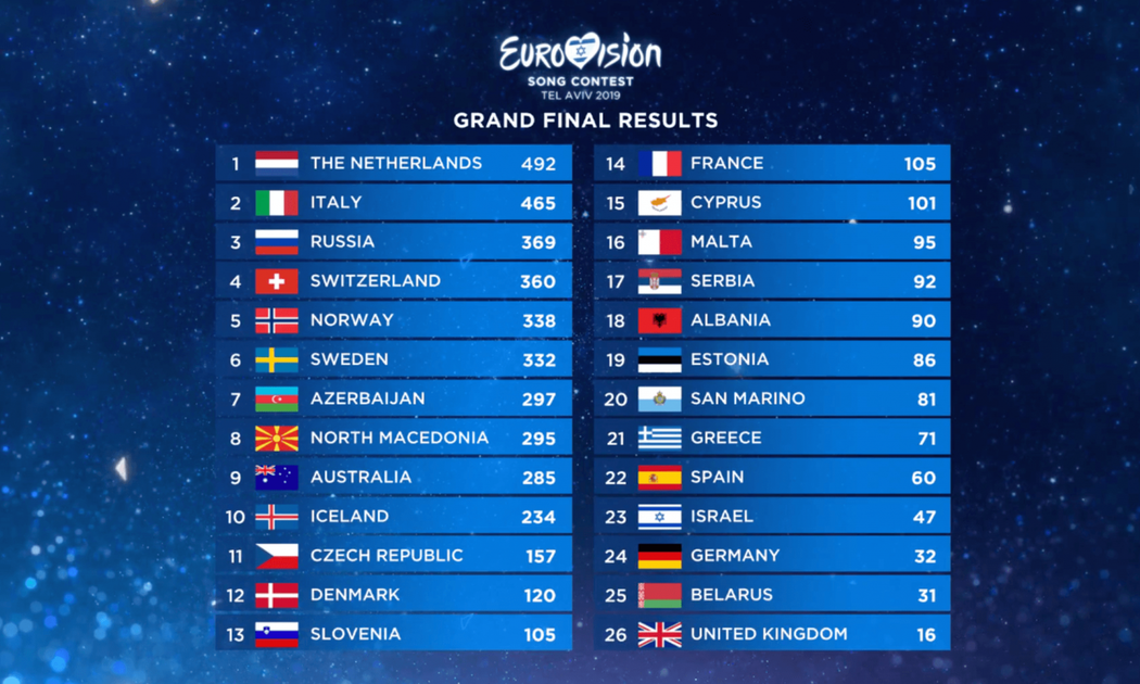 12Κύπρος10Ρωσία8Αζερμπαϊτζάν7Ιταλία6Άγιος Μαρίνος5Μάλτα4Σλοβενία3Αλβανία2Αυστραλία1Βόρεια Μακεδονία