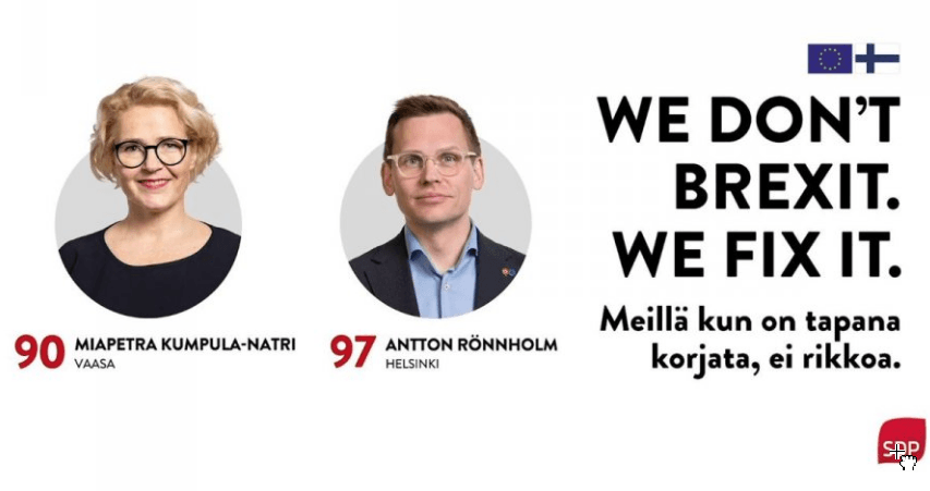 Καθώς οι Φιλανδοί Σοσιαλδημοκράτες προετοιμάζονται για τις εκλογές της Ευρωπαϊκής Ένωσης στις 26 Μαΐου, το κόμμα έχει γεμίσει με αφίσες γραμμένες στα αγγλικά ολόκληρη τη χώρα, οι οποίες προωθούν την ιδέα ότι η επιλογή της εξόδου από την ΕΕ που έκανε η Βρετανία είναι κάτι το οποίο πρέπει να αποφευχθεί με κάθε κόστος.