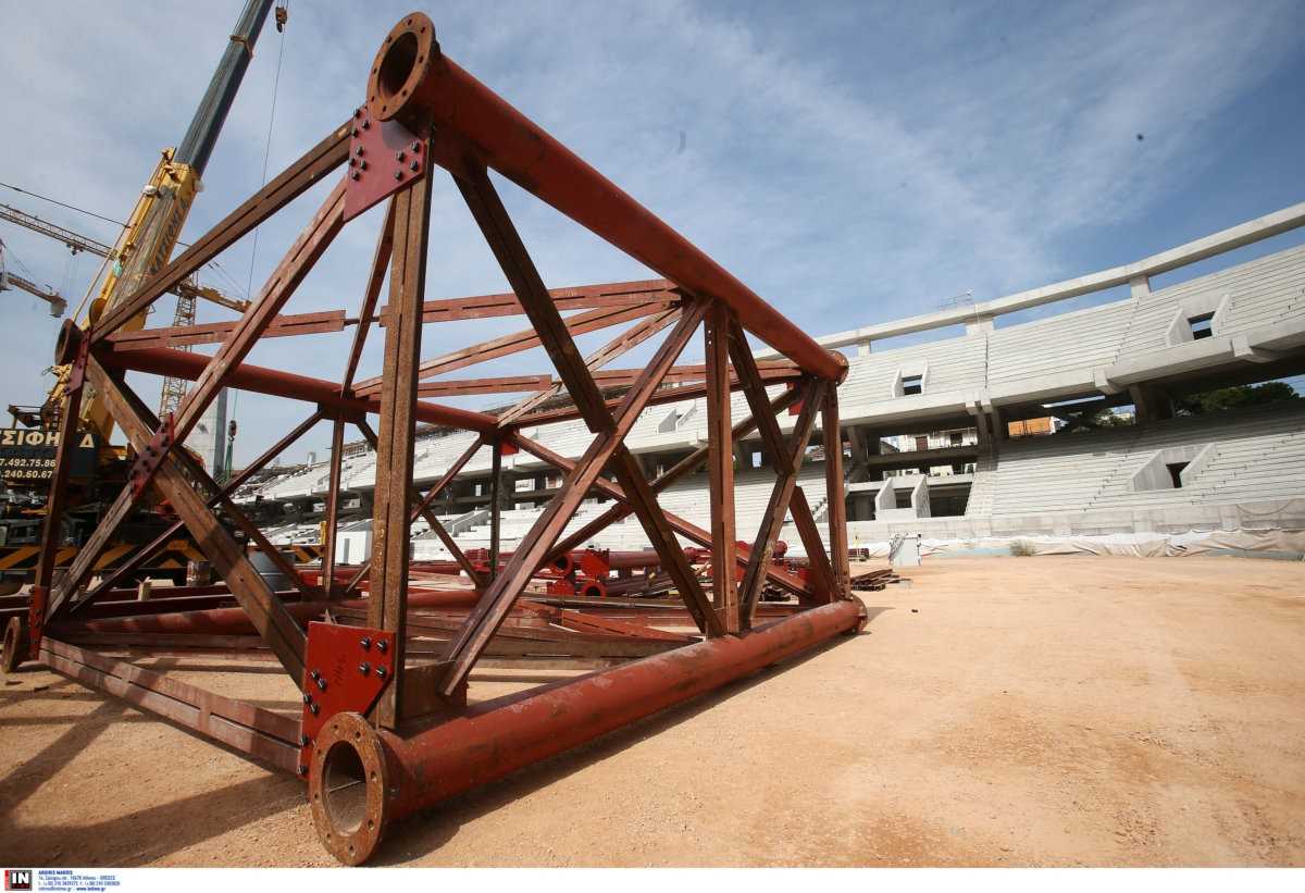 Οι Ιταλοί της Cimolai έχουν… σηκώνει μανίκια στο εργοτάξιο της Νέας Φιλαδέλφειας και προχωρούν εντατικά στην συναρμολόγηση των πύργων, πάνω στους οποίους θα στηριχθεί προσωρινά το στέγαστρο του νέου γηπέδου της ΑΕΚ, μέχρι την αιώρηση του από τους τέσσερις πυλώνες.