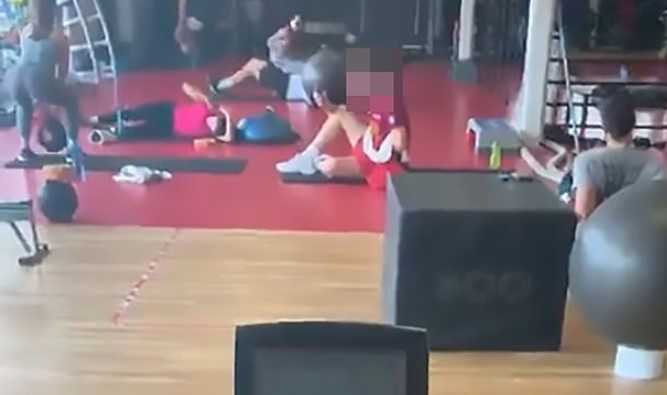 Στο υλικό όπως το κατέγραψε άλλος θαμώνας, καταγράφεται ο άνδρας να κάθεται στο πάτωμα λίγα εκατοστά μακριά από τη γυναίκα που κάνει καθίσματα. Ενώ φαίνεται να χρησιμοποιεί το κινητό του με το δεξί του χέρι, το άλλο κινείται έντονα μέσα στο σορτσάκι του ενώ πάνω του έχει ρίξει μια πετσέτα.
