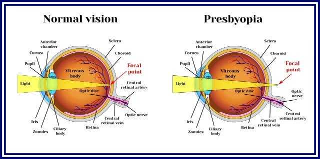 Η πρεσβυωπία εκδηλώνεται περίπου στην ηλικία των 40-45 ετών. Εκδηλώνεται ως εξής: H πρεσβυωπία οφείλεται στη φθορά (με την γήρανση) του κρυσταλλοειδούς, φυσικού φακού του οφθαλμού και ελάττωση της προσαρμοστικότητας (ικανότητα προσαρμογής εστίασης) του στις κοντινές αποστάσεις.