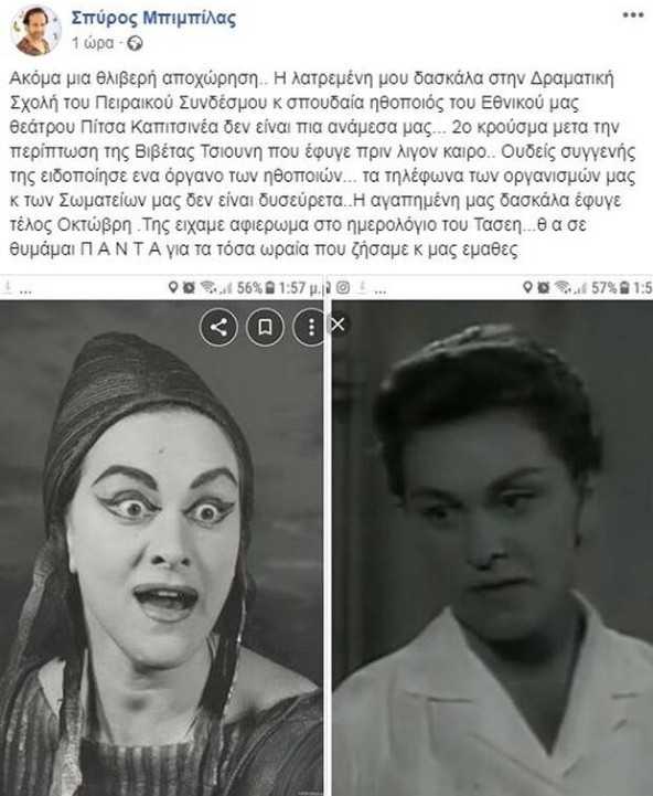 «Ακόμα μια θλιβερή αποχώρηση.. Η λατρεμένη μου δασκάλα στην Δραματική Σχολή του Πειραικού Συνδέσμου κ σπουδαία ηθοποιός του Εθνικού μας θεάτρου δεν είναι πια ανάμεσα μας… 2ο κρούσμα μετα την περίπτωση της Βιβέτας Τσιουνη που έφυγε πριν λιγον καιρο.. Ουδείς συγγενής της ειδοποίησε ενα όργανο των ηθοποιών… τα τηλέφωνα των οργανισμών μας κ των Σωματείων μας δεν είναι δυσεύρετα..Η αγαπημένη μας δασκάλα έφυγε τέλος Οκτώβρη .Της ειχαμε αφιερωμα στο ημερολόγιο του Τασεη…θ α σε θυμάμαι Π Α Ν Τ Α για τα τόσα ωραία που ζήσαμε κ μας εμαθες», έγραψε χαρακτηριστικά στη λεζάντα του.