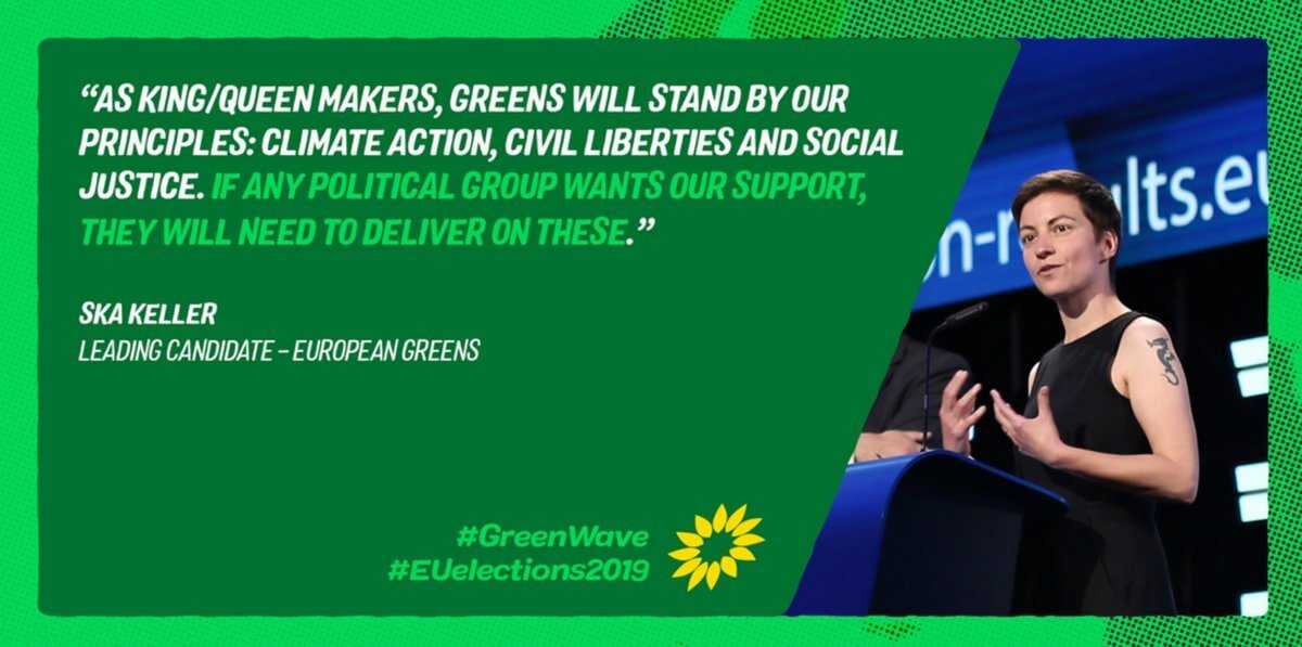 Ερωτηθείσα στη γερμανική τηλεόραση, η επικεφαλής των ευρωπαίων Πρασίνων αρνήθηκε να δηλώσει την προτίμησή της: «Αυτό που μας ενδιαφέρει, είναι να γίνουν δεκτές οι προτάσεις μας», τόνισε η Σκα Κέλερ.Ευρωεκλογές 2019: Πράσινο κύμα