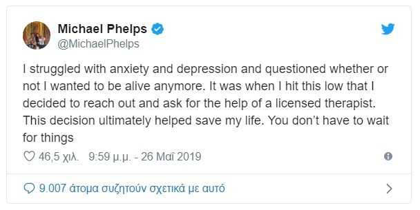 Ο Μάικλ Φελπς θέλησε έτσι για μία ακόμη φορά να στείλει ένα μήνυμα προς όλο τον κόσμο, γράφοντας στο twitter: «Έδωσα μάχη με το άγχος και την κατάθλιψη και αμφέβαλα ακόμη και για το αν θέλω να ζήσω ή όχι. Όταν έφτασα σε αυτό το κατώτατο σημείο, αποφάσισα να ζητήσω βοήθεια ενός επαγγελματία. Η απόφαση αυτή τελικά έσωσε τη ζωή μου. Δεν πρέπει να περιμένεις για κάποια πράγματα».