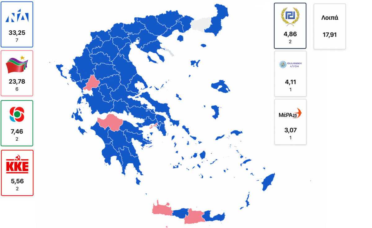 Αναφορικά με την εκλογική δύναμη των κομμάτων, όπως αποτυπώθηκε στις ευρωεκλογές (καθώς για τις αυτοδιοικητικές εκλογές αναμένεται επανάληψη της διαδικασίας την ερχόμενη Κυριακή), Ο ΣΥΡΙΖΑ διατήρησε τον αριθμό των βουλευτών του (6) αλλά είδε τα ποσοστά του να μειώνονται κατά 3% περίπου.Συγκεκριμένα, το 2014 είχε λάβει το 26,56% των ψήφων (6 έδρες) και χθες έλαβε το 23,80% των ψήφων (6 έδρες).