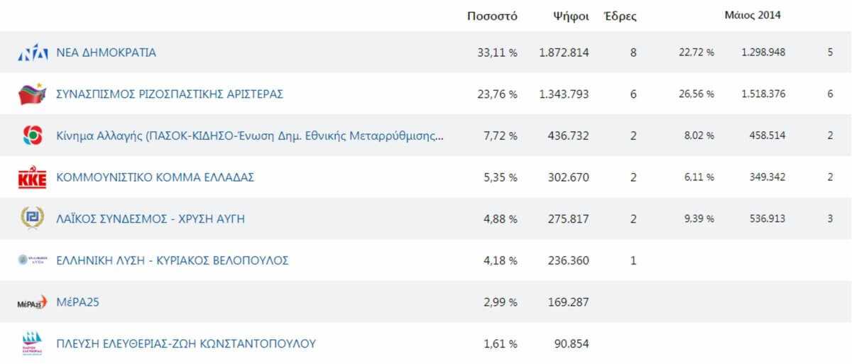 Η ΝΔ κερδίζει 8 έδρες στο νέο Ευρωπαϊκό Κοινοβούλιο, ο ΣΥΡΙΖΑ 6 έδρες, το ΚΙΝΑΛ, το ΚΚΕ και η Χρυσή Αυγή από δύο έδρες, ενώ μία έδρα κερδίζει η Ελληνική Λύση. Εκτός έμεινε το ΜέΡΑ25 του Γιάνη Βαρουφάκη, που συγκέντρωσε ποσοστό 2,99%.Αποτελέσματα ευρωεκλογών – Αναλυτικά τα ποσοστά και οι ψήφοι όλων των κομμάτων που συμμετείχαν στην ευρω-μάχη