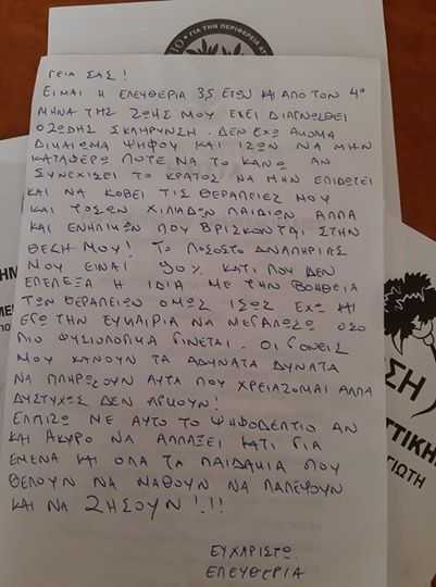 Απευθυνόμενος στους πολιτικούς της χώρας που επιζητούν την ψήφο των πολιτών ο γονιός έγραψε σε πρώτο πρόσωπο (σαν να είναι η κόρη του) για την περιπέτεια υγείας της μικρής Ελευθερίας στο πίσω μέρος ενός ψηφοδελτίου.