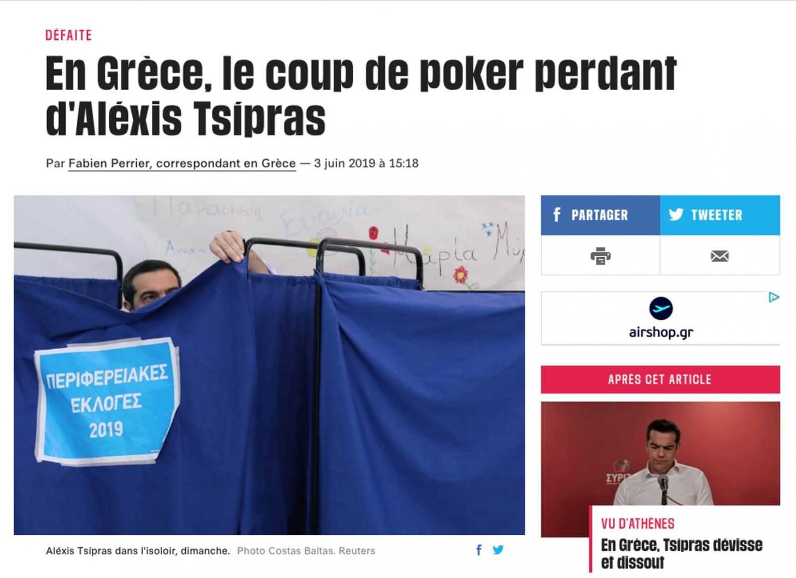 Η Liberation γράφει για τις εκλογές και τα αποτελέσματά τους: «Ο Έλληνας πρωθυπουργός μετέτρεψε την προεκλογική του εκστρατεία σε μία μονομαχία με τον Κυριάκο Μητσοτάκη, ηγέτη της ΝΔ και υπέστη συντριπτική ήττα. Ανακοίνωσε το βράδυ της 26ης Μαΐου, τη διεξαγωγή πρόωρων εκλογών, ελπίζοντας να σωθεί αλλά αυτό δεν συνέβη».