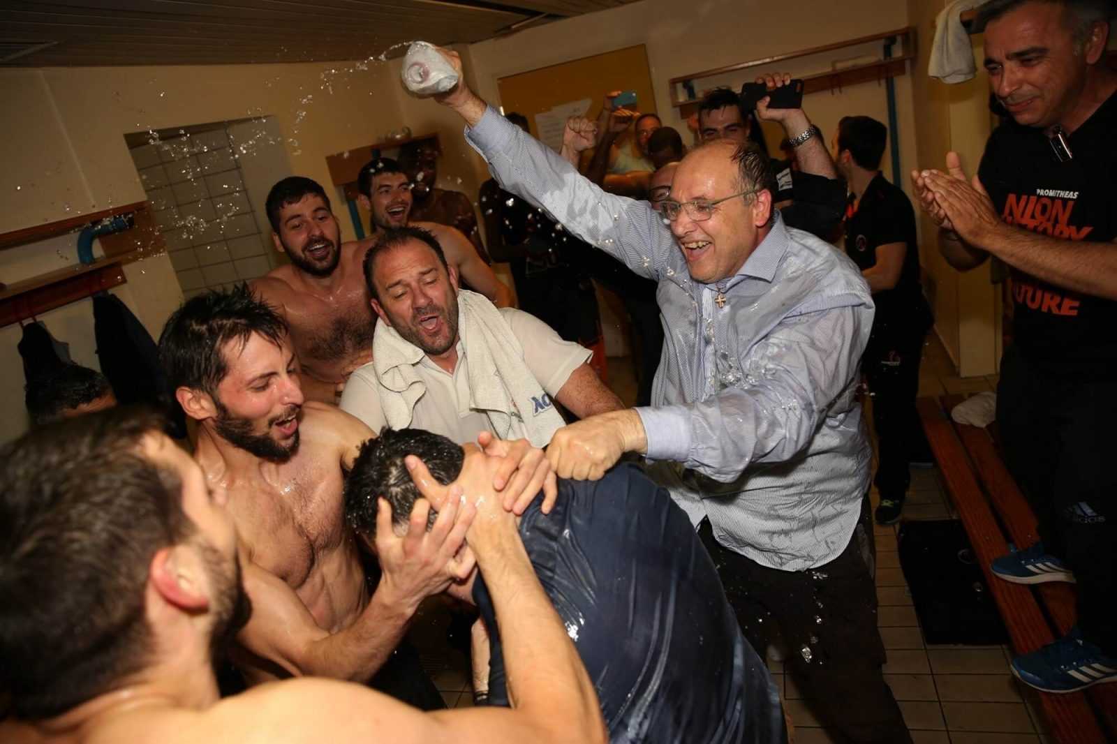 Ο πρόεδρος της ομάδας, Βαγγέλης Λιόλιος, έπλεε σε πελάγη ευτυχίας και χαρακτηριστική είναι η στιγμή στα αποδυτήρια, όπου μπουγέλωσε τον Μάκη Γιατρά.