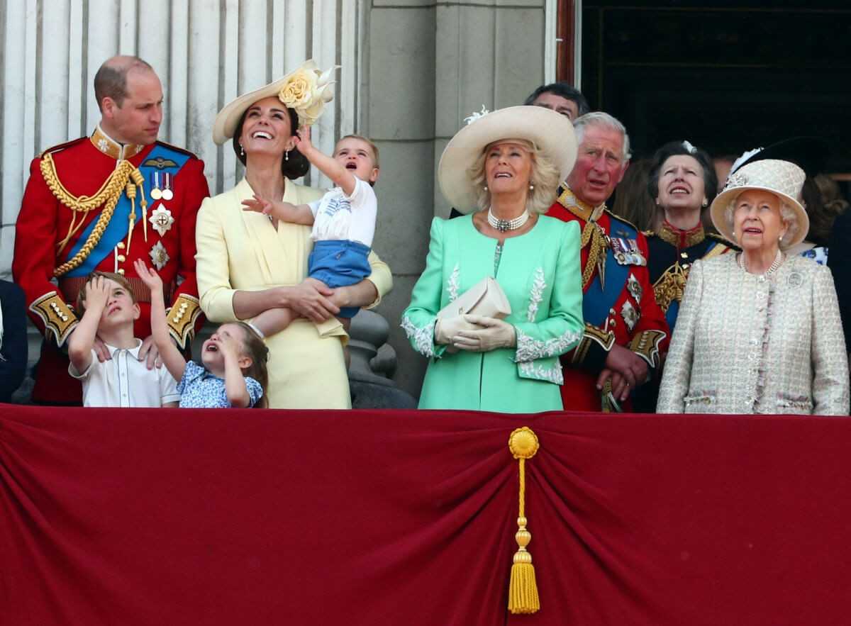 Αφού επιθεώρησε τα αγήματα (με τις λιποθυμίες να μη λείπουν ούτε φέτος), η Βασίλισσα Ελισάβετ εμφανίστηκε μαζί με την υπόλοιπη βασιλική οικογένεια στο μπαλκόνι του Μπάκιγχαμ για να χαιρετίσει το πλήθος αλλά και να παρακολουθήσει τις πτήσεις των μαχητικών προς τιμήν της.