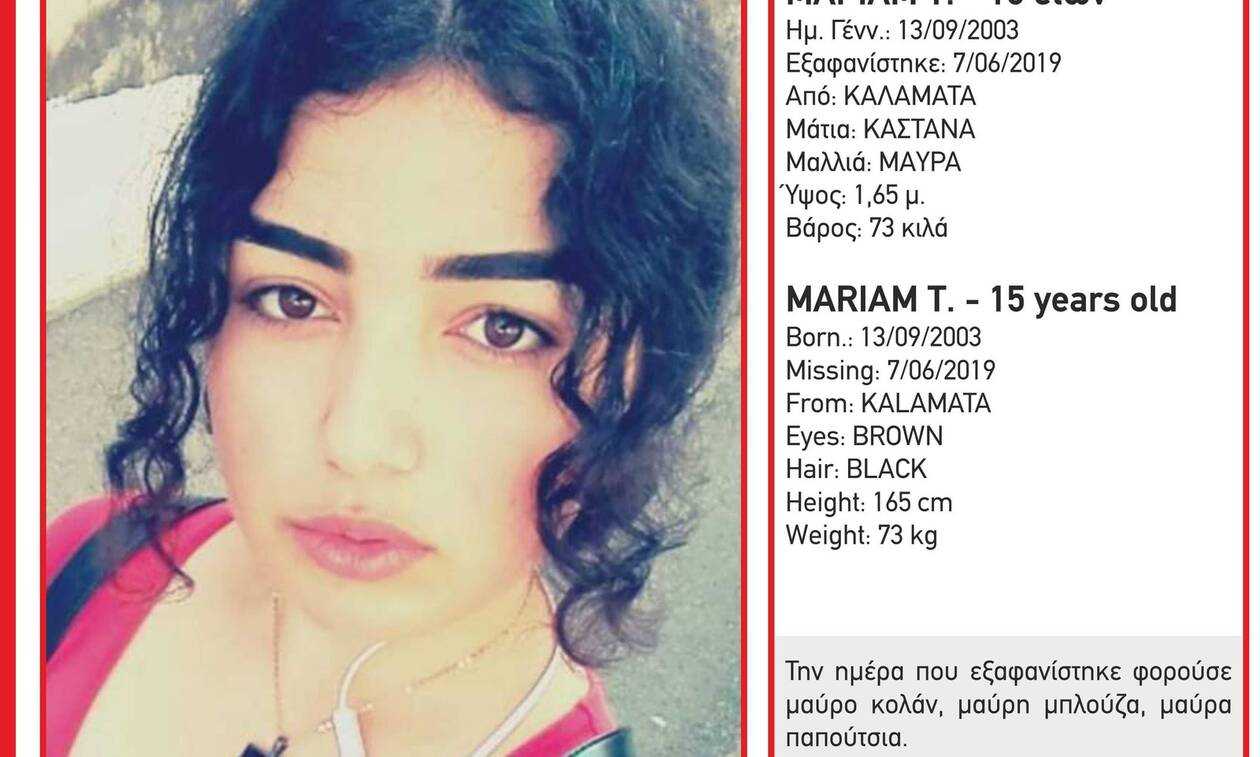 Όπως αναφέρεται στην ανακοίνωση, η Μαριάμ εξαφανίστηκε από το σπίτι της, έχει ύψος 1,65 μ., ζυγίζει 73 κιλά, έχει μαύρα μαλλιά και καστανά μάτια. Φορούσε μαύρο κολάν, μαύρη μπλούζα και μαύρα παπούτσια.
