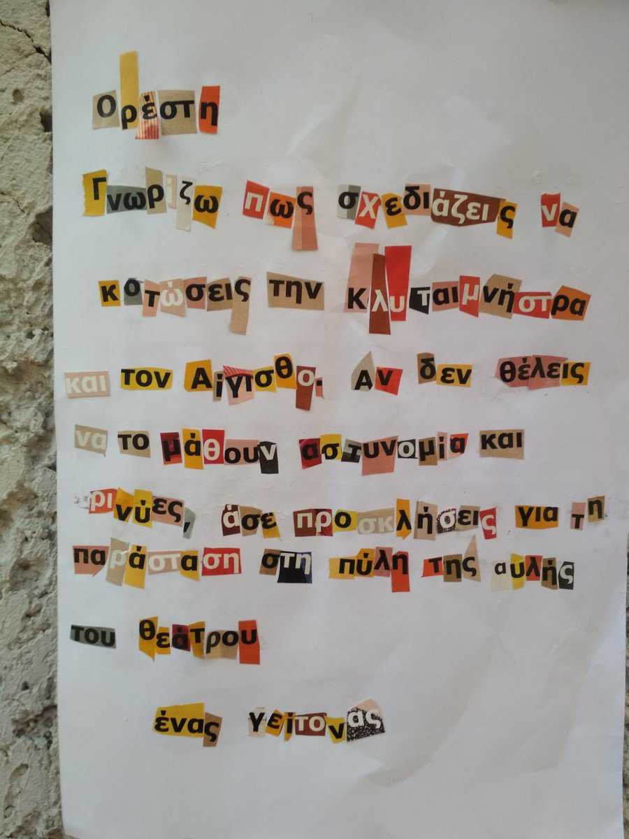 «Στο προαύλιο του Εθνικού που κάνουμε πρόβες της Ορέστειας, γύρω γύρω έχει πολυκατοικίες. Στήνουν καρέκλα στα μπαλκόνια και μας παρακολουθούν, όπως κι οι περαστικοί.