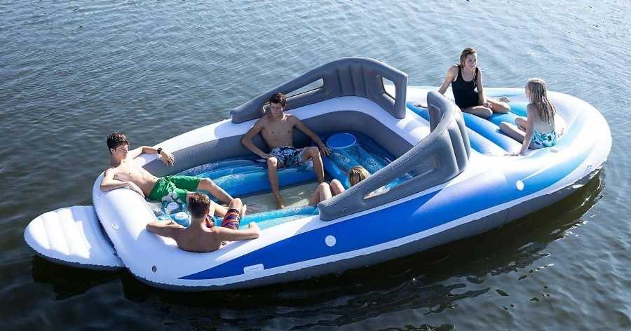 Το φουσκωτό Bay Breeze Boat Party Island ίσως είναι ο καλύτερος τρόπος για να περάσετε ξέγνοιαστα σε λίμνη ή σε ποτάμι. Οι διαστάσεις του είναι 6 x 3 x 1 μέτρα και ζυγίζει περίπου 30 κιλά. Σύμφωνα με τις ερωτήσεις και τις απαντήσεις των πελατών στο Amazon, χρειάζονται περίπου 20 λεπτά για να φουσκώσει πλήρως.