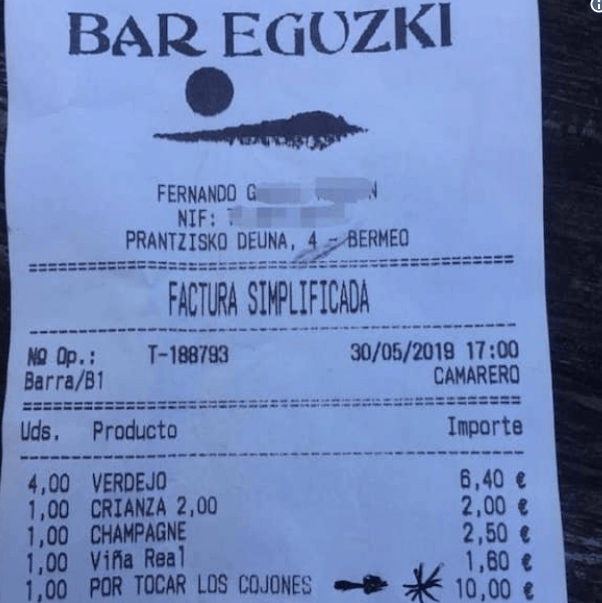 Σε ένα εστιατόριο ένας πελάτης χρεώθηκε με 10 ευρώ επειδή… έπρηξε τη σερβιτόρα σε ελεύθερη μετάφραση: «por tocar los cojones» έγραφε ακριβώς η σημείωση.