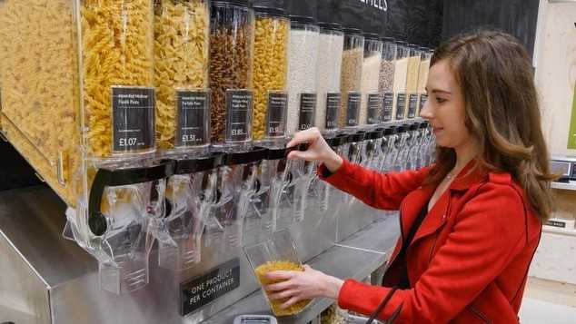 Μια μεγάλη αλυσίδα σουπερμάρκετ, η Waitrose, με σχεδόν 350 σημεία πώλησης σε όλη τη χώρα, αποφάσισε δοκιμαστικά για έντεκα εβδομάδες, σε ένα κατάστημά της στην Οξφόρδη, να καταργήσει τις πλαστικές συσκευασίες μίας χρήσης. Στο πλαίσιο του πιλοτικού προγράμματος, μεταξύ άλλων, οι πελάτες ανεφοδιάζονται στεγνά τρόφιμα -από φακές μέχρι κινόα- μέσα από ντισπένσερ που έχουν τοποθετηθεί στο κατάστημα, η πλαστική μεμβράνη στις γλάστρες και τις ανθοδέσμες έχει αντικατασταθεί από 100% ανακυκλωμένο χαρτί, ενώ τα φρούτα και τα λαχανικά μπαίνουν σε βαμβακερές τσάντες, σε σακούλες που μπορούν να κομποστοποιηθούν ή, τα πιο ευάλωτα, σε χάρτινες κούτες. Ακόμα και τα ποτά πωλούνται σε επαναχρησιμοποιούμενα μπουκάλια.
