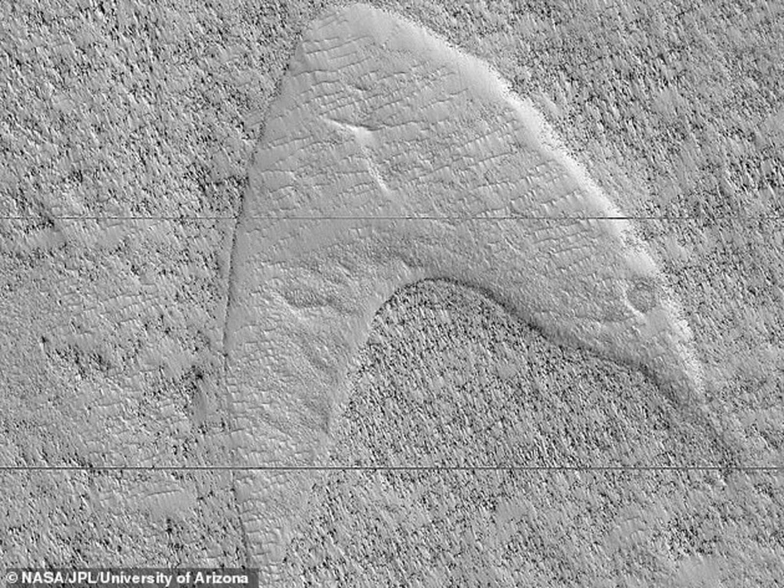 Η NASA έδωσε στη δημοσιότητα μια δορυφορική φωτογραφία που τράβηξε το σκάφος της Mars Reconnaissance Orbiter (MRO) και η οποία δείχνει στο νότιο ημισφαίριο του Άρη έναν αρειανό αμμόλοφο με ασυνήθιστο σχήμα, που έχει… διαβολική ομοιότητα με το σχήμα V του διάσημου λογότυπου του Star Trek.
