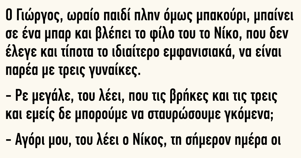 Ο Γιώργος ωραίο παιδί πλην όμως μπακούρι μπαίνει σε ένα μπαρ 4 Μαΐου 2019 15:36 FacebookTwitterTelegramViberWhatsAppLinkedinEmail Ο Γιώργος ωραίο παιδί πλην όμως μπακούρι μπαίνει σε ένα μπαρ FacebookTwitterTelegramViberWhatsAppLinkedinEmail Προηγούμενο άρθροΑδιανόητο. Διαρρήκτης έκοψε το χέρι ανάπηρης γιαγιάς για να της πάρει τα δαχτυλίδια.Επόμενο άρθροΠΑΣ Γιάννινα – ΠΑΟΚ: Η “ασπρόμαυρη” αποστολή για το αήττητο Μπορεί να σας αρέσουν Ανέκδοτα 45αρης “καυτός” σε ανέκδοτο: “Έτσι βγαίνει ένα διαζύγιο” 25 Νοεμβρίου 2025 20:18 Ανέκδοτα Βουνίσιος βοσκός σε ανέκδοτο: Δεν έβρισκε λύση… 25 Νοεμβρίου 2025 17:18 Ανέκδοτα Ξανθιά γειτόνισσα σε ανέκδοτο “Γιατί κοκκινίζουν;” 25 Νοεμβρίου 2025 13:54 Αφήστε ένα μήνυμα Σχόλιο: εισάγετε το σχόλιό σας! Όνομα: παρακαλώ εισάγετε το όνομά σας εδώ Email: έχετε εισάγει εσφαλμένη διεύθυνση ηλεκτρονικού ταχυδρομείου! παρακαλώ εισάγετε εδώ την ηλεκτρονική σας διεύθυνση Ιστοσελίδα: αποθηκεύστε το όνομα, το ηλεκτρονικό ταχυδρομείο και τον ιστότοπό μου σε αυτό το πρόγραμμα περιήγησης για την επόμενη φορά που θα σχολιάσω.