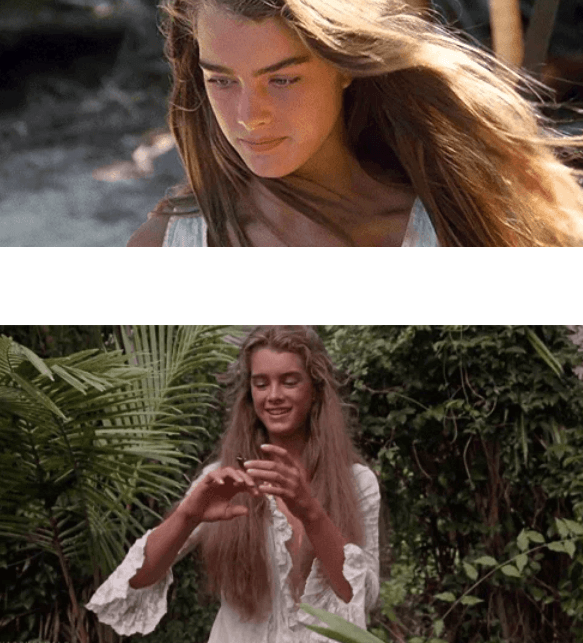 Ίδια, στο πιο ξανθό, με την Brooke Shields στη Γαλάζια Λίμνη. Για την ιστορία, η Shields όταν πρωταγωνίστησε στην ταινία ήταν μόλις 14 ετών. Οι παραγωγοί χρειάστηκε να λογοδοτήσουν στη Γερουσία και να αποδείξουν ότι στις γυμνές σκηνές η πρωταγωνίστρια είχε αντικατασταθεί από μια ενήλικη συνάδελφο της. Στα πολύ κοντινά πλάνα κάτι τέτοιο ήταν αδύνατο κι έτσι τα μακριά μαλλιά της ήταν κολλημένα με αυτοκόλλητη ταινία στο στήθος της.