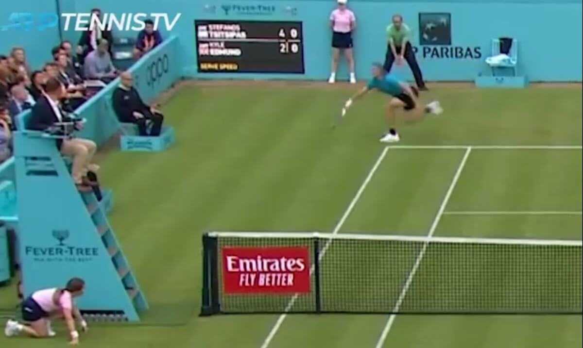 Σε μια προσπάθεια του να βγάλει άμυνα, σε σερβίς του Κάιλ Έντμπουντ, ο Στέφανος Τσιτσιπάς δεν βρήκε καλά το μπαλάκι και το έστειλε στο… δόξα πατρί του επόπτη που βρισκόταν στα δεξιά του.