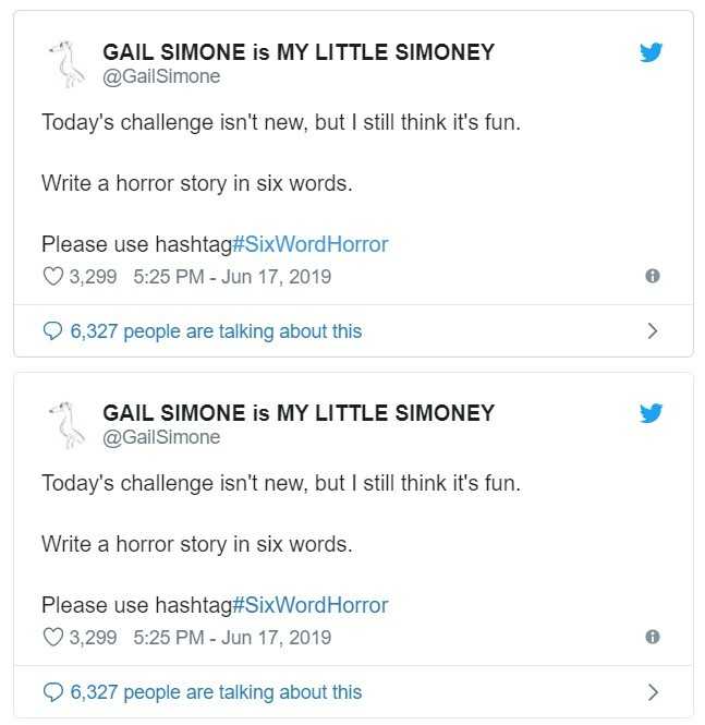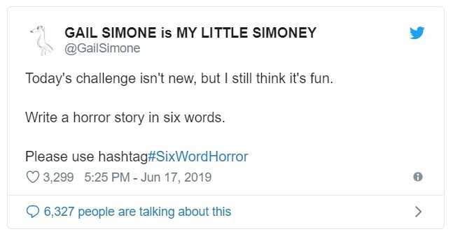 Όλα ξεκίνησαν την περασμένη Δευτέρα (17/06/2019) με τη Gail Simone να δίνει το έναυσμα μέσω Twitter υπό το hashtag #SixWordHorror. «H σημερινή πρόκληση δεν είναι καινούργια, αλλά νομίζω πως ακόμη έχει ενδιαφέρον. Γράψτε μια ιστορία τρόμου με έξι λέξεις», έγραψε η διάσημη συγγραφέας.