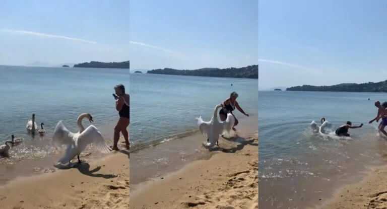 Ωστόσο ο ένας κύκνος μάλλον δεν αγαπά τη δημοσιότητα και κινείται επιθετικά προς τη γυναίκα. Η τουρίστρια αρχικά οπισθοχωρεί, αλλά επανέρχεται προκείμενου να προσπαθήσει ξανά να βγάλει φωτογραφία. Ο κύκνος επιτίθεται εκ νέου και η γυναίκα καταλήγει… στη θάλασσα.