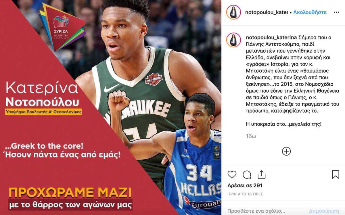 Δεν ήταν, φυσικά, μόνο η Κατερίνα Νοτοπούλου, υποψήφια βουλευτής με τον ΣΥΡΙΖΑ, που θέλησε να στείλει το δικό της μήνυμα με αφορμή τη μοναδική επιτυχία του Γιάννη Αντετοκούνμπο. Απλά εκείνο το… παράκανε λίγο.