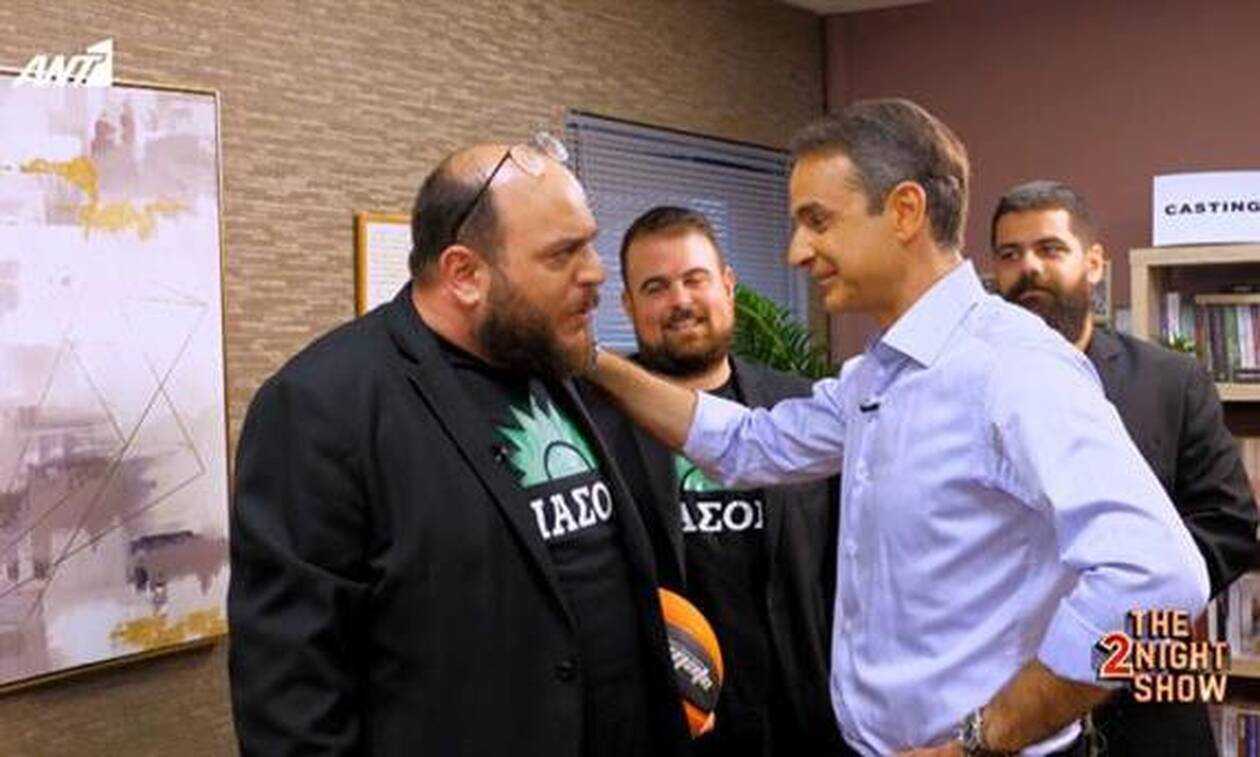 Μάλιστα πριν βρεθεί στο πλατό του «The 2night show», ο Κυριάκος Μητσοτάκης πέρασε από τις «Μύγες» και η συνάντησή τους ήταν… επική. Οι τρεις stand up κωμικοί τον υποδέχθηκαν με σημαίες του ΠΑΣΟΚ και ο Κυριάκος Μητσοτάκης τους είπε: «Οι σημαίες είναι vintage…» και στη συνέχεια απάντησε σε ερωτήσεις όπως «πόσα κιλά είναι ο Γρηγόρης Αρναούτογλου και είναι τριψήφιος αριθμός».