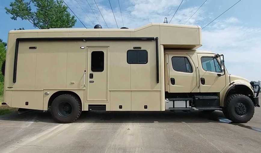 Βαμμένο στο χρώμα της άμμου, τιμάει την στρατιωτική του υπόσταση, διαθέτει 4 πόρτες (χαρακτηριστικό αρκετά σπάνιο για αυτοκινούμενο), ενώ η κίνηση μεταφέρεται και στους τέσσερις τροχούς, κάτι επίσης σπάνιο! Ως βάση για το συγκεκριμένο RV είναι ένα μοντέλο της Freightliner (εταιρεία που δημιουργεί τράκτορες αντοχής), ενώ κάτω από το καπό του υπάρχει ένας 6κύλινδρος σε σειρά πετρελαιοκινητήρας της Cummings, απόδοσης 350 ίππων και με ροπή 1.100 Nm, νούμερα ικανό για να ρυμουλκήσουν φορτίο 9 τόνων!