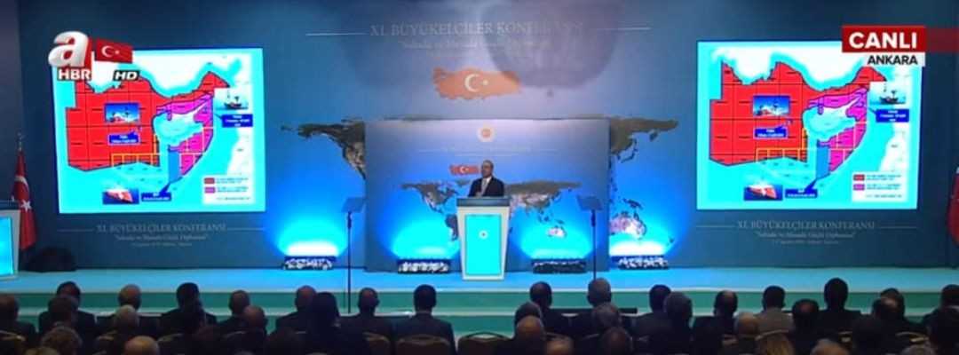 Σε μία προκλητική ενέργεια προχώρησε η Άγκυρα με την απόφαση του υπουργού Εξωτερικών της Τουρκίας, Μεβλούτ Τσαβούσογλου να παρουσιάσει σε ομιλία του στο 11ο Συνέδριο των Πρεσβευτών χάρτη με την τουρκική υφαλοκρηπίδα που φτάνει μέχρι την Κρήτη