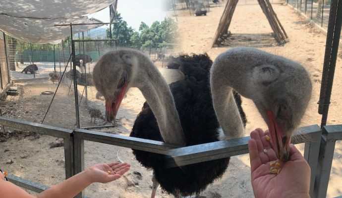 Στους στρουθοκάμηλους, ο νεαρός που βρίσκεται στον χώρο, θα σου δώσει όσες φορές θέλεις καλαμπόκι για να τους ταϊσεις. Πρέπει να ζήσεις την εμπειρία και να χαϊδέψεις τον μακρύ λαιμό τους. Οι στρουθοκάμηλοι το λατρεύουν. Όπως και τις σέλφι. Και δεν είναι οι μόνοι. Σελφι μπορείς να βγάλεις με τους πανέμορφους γαιδαράκους, το πόνυ, τις καμήλες, τα κατσικάκια που όταν δεν τα ταΐζεις τους αρέσει να κάνουν μονομαχίες με τα μικρά τους κέρατα, ενώ θα λατρέψεις ακόμα και τα αγριογούρουνα που θα κάνουν σαν παλαβά όταν σε δουν με καρότα και μαρούλι στο χέρι!