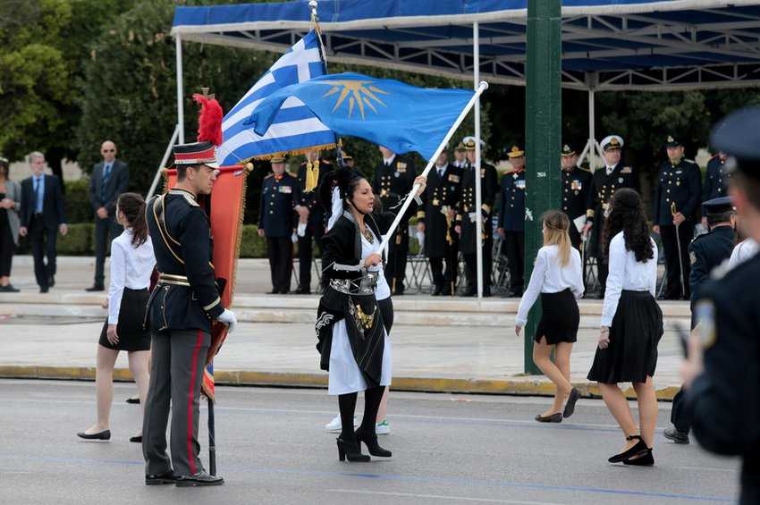 Επεισοδιακή ήταν η μαθητική παρέλαση στην Αθήνα, καθώς ένας άνδρας και μία γυναίκα, ντυμένοι με παραδοσιακές φορεσιές, κρατώντας σημαίες, η μία με τον ήλιο της Βεργίνας, παρεισέφρησαν ανάμεσα στα σχολεία και παρέλασαν, σταματώντας μπροστά από την εξέδρα των επισήμων και φωνάζοντας συνθήματα.