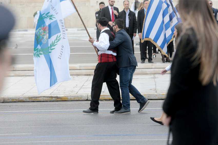 Αστυνομικοί απομάκρυναν και άνδρα ντυμένο με παραδοσιακή φορεσιά ο οποίος κρατώντας σημαία παρεισέφρησε ανάμεσα στα σχολεία και παρέλασε!