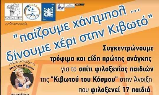 Ο Δήμος Διονύσου, ο Α.Σ. Άνοιξης Διονύσου (ΑΣΑΔ) Χάντμπολ  και η Ομοσπονδία Χειροσφαίρισης Ελλάδας (ΟΧΕ), με την υποστήριξη της Ένωσης Σωματείων Χειροσφαίρισης Αττικής (ΕΣΧΑ), του Εμπορικού & Επαγγελματικού Συλλόγου Διονύσου και του  Σώματος Εθελοντών Σαμαρειτών, Διασωστών και Ναυαγοσωστών του Ερυθρού Σταυρού συνδιοργανώνουν την Κυριακή 4 Νοεμβρίου 2018 και ώρας 10.00 πμ έως 14.00μμ  στο κλειστό Γυμναστήριο Άνοιξης (Κανάρη 3 – Άνοιξη),  έναν ξεχωριστό και πρωτότυπο αγώνα χάντμπολ, με συναθλητές σ’ αυτή την πρωτοβουλία επίλεκτους διεθνείς αθλητές χάντμπολ, ολυμπιονίκες, καλλιτέχνες και δημοσιογράφους.