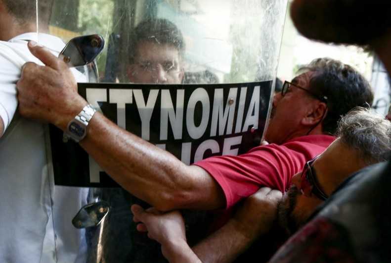 Από νωρίς μέλη του ΠΑΜΕ βρέθηκαν έξω από το συμβολαιογραφείο για να συμπαρασταθούν στην οικογένεια και κάποια στιγμή προκλήθηκε ένταση και οι συγκεντρωμένοι συνεπλάκησαν με τους αστυνομικούς.
