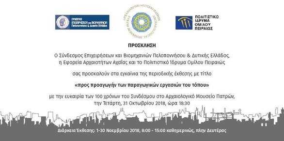Για να τιμήσει την επέτειο αυτή, ο Σύνδεσμος συνδιοργανώνει με την Εφορεία Αρχαιοτήτων Αχαΐας και το Πολιτιστικό Ίδρυμα Ομίλου Πειραιώς (ΠΙΟΠ) Έκθεση στο Αρχαιολογικό Μουσείο Πατρών με τίτλο «Προς προαγωγήν των παραγωγικών εργασιών του τόπου» προκειμένου να αναδειχθεί η παραγωγική ιστορία της ευρύτερης περιοχής κατά τον τελευταίο αιώνα.