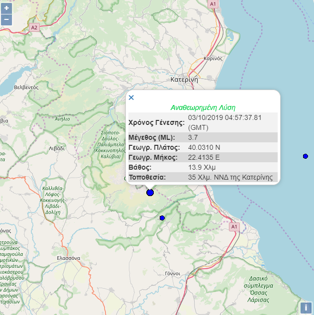 Ο σεισμός ήταν 32 χιλιόμετρα νοτιοδυτικά της Κατερίνης και είχε εστιακό βάθος 10 χιλιόμετρα.
