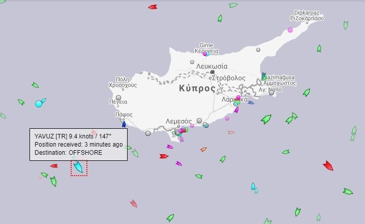 To τουρκικό γεωτρύπανο Γιαβούζ, από το απόγευμα της Πέμπτης (03/10) σύμφωνα με το Marine Traffic, έφτασε στο τεμάχιο 7 στην Κυπριακή ΑΟΖ που έχει αδειοδοτηθεί ως γνωστό από την Κυπριακή Δημοκρατικά στην γαλλοϊταλική κοινοπραξία ENI – Total.