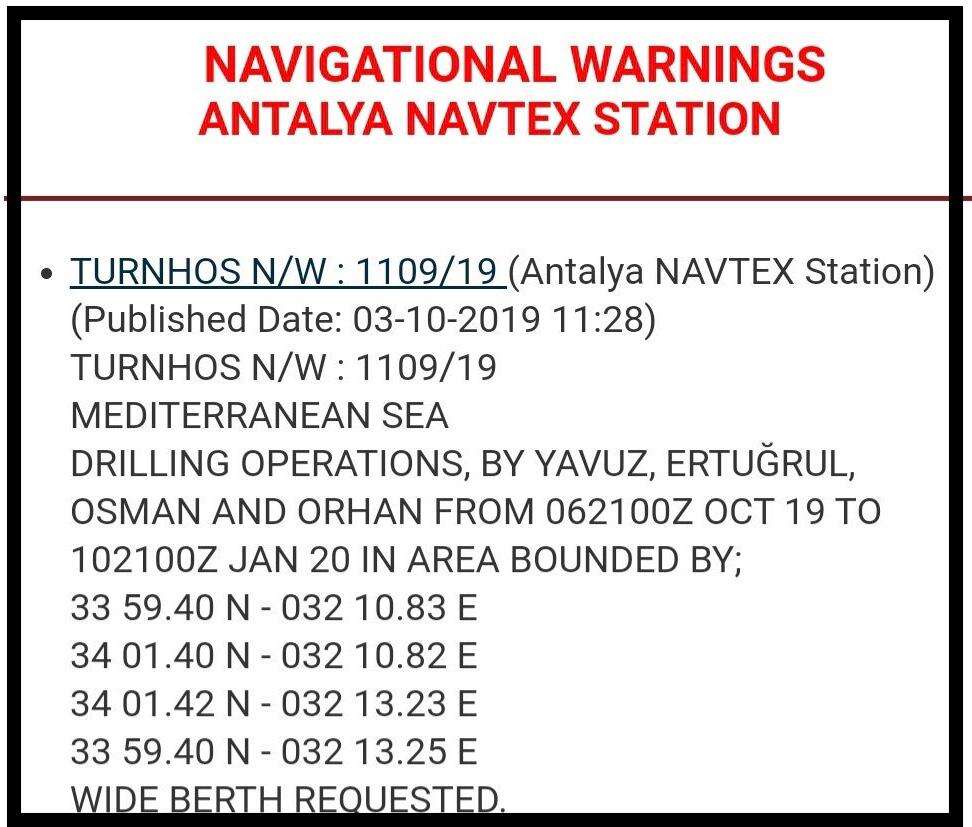 Η Τουρκία, εξέδωσε λοιπόν νέα Navtex σήμερα Πέμπτη (3/10) και δεσμεύει την περιοχή του οικοπέδου 7 της Κυπριακής ΑΟΖ από την ερχόμενη Κυριακή 6 Οκτωβρίου στις 21:00 το βράδυ μέχρι τις 10 Ιανουαρίου του 2020 επίσης στις 21:00 το βράδυ.