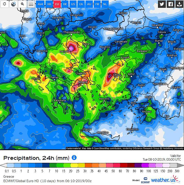 Όπως φαίνεται στον χάρτη από το προγνωστικό μοντέλο ECMWF αναμένονται αρκετά μεγάλα ύψη βροχής και στην Αττική. Αξίζει να σημειωθεί ότι στην Αττική αύριο, Δευτέρα (7/10) θα σημειωθούν και σποραδικές καταιγίδες.