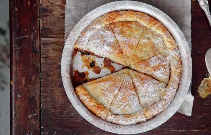Σκεπάζουμε τη γέμιση με τα υπόλοιπα φύλλα κρούστας, βουτυρωμένα και πασπαλισμένα με ζάχαρη ένα ένα. Βουτυρώνουμε την επιφάνεια της πίτας και τη χαράζουμε σε καρεδάκια. Την ψήνουμε για 40-45 λεπτά ή μέχρι να ροδίσει. Ξεφουρνίζουμε και την αφήνουμε να γίνει χλιαρή. Πασπαλίζουμε με ζάχαρη άχνη και κανέλα και σερβίρουμε.