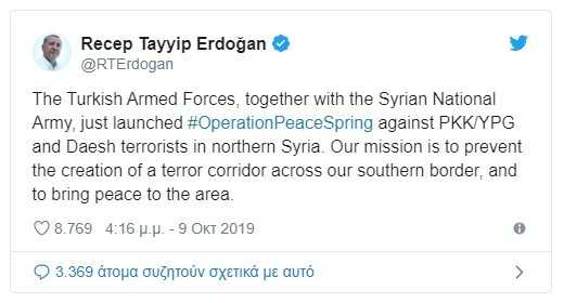 Ο πρόεδρος της Τουρκίας Ταγίπ Ερντογάν ανακοίνωσε πως άρχισε η τουρκική στρατιωτική επιχείρηση στη βορειοανατολική Συρία, ενώ τις προηγούμενες ημέρες προωθούνταν σε στρατηγικά σημεία στα σύνορα ισχυρές στρατιωτικές δυνάμεις.