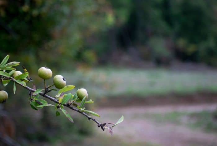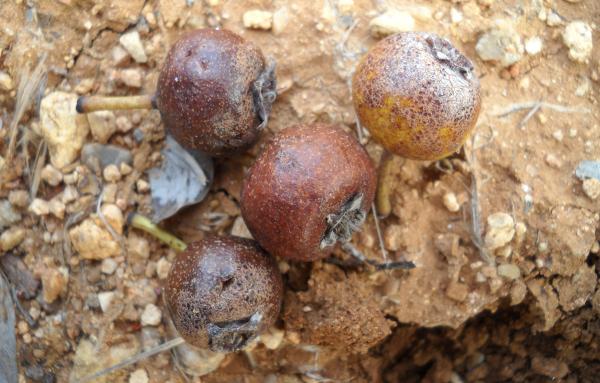 Ο καρπός της είναι μικρός και σφαιρικός, με διάμετρο περίπου 2 – 3 εκατοστά, πράσινος και στυφός όταν είναι άγουρος. Όταν ωριμάζει παίρνει το καστανοκίτρινο χρώμα και είναι πιο γλυκός. Φυτρώνει συνήθως σε υψόμετρο μέχρι 1500 μέτρων.