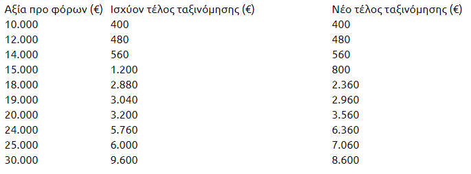 – Για αυτοκίνητα με φορολογητέα αξία μέχρι και 14.000 €, 4% (χωρίς αλλαγή)