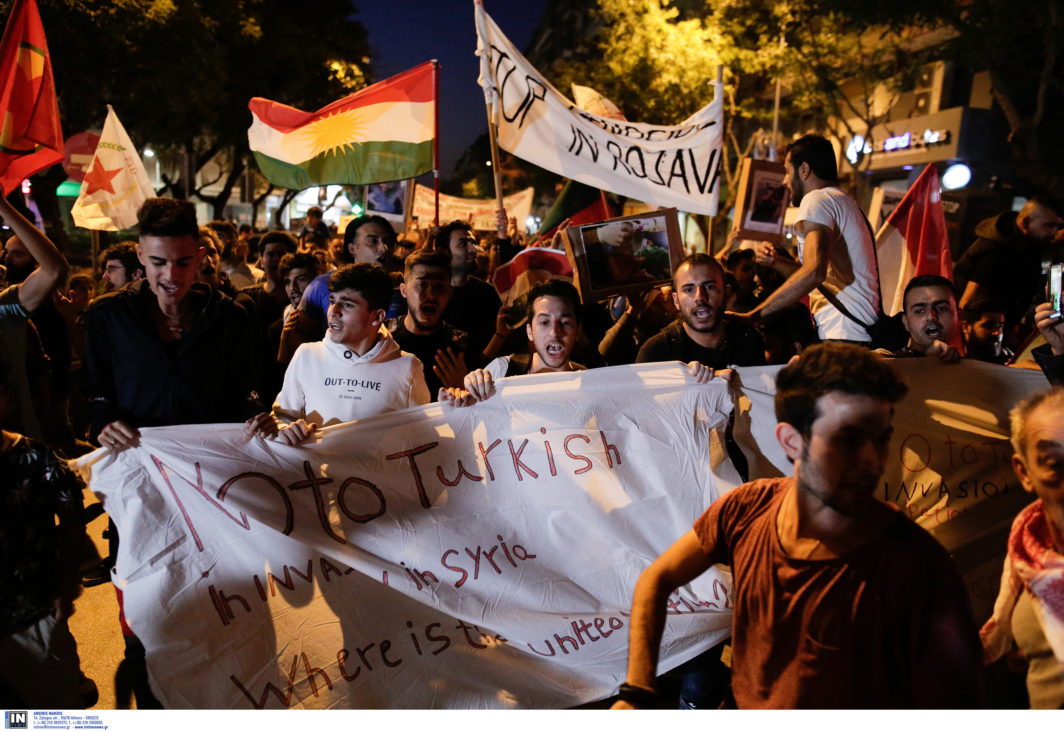 Πορεία διαμαρτυρίας ενάντια στην τουρκική εισβολή στη Συρία, πραγματοποίησαν στο κέντρο της Θεσσαλονίκης Κούρδοι και μέλη σχημάτων της εξωκοινοβουλευτικής Αριστεράς, εκφράζοντας παράλληλα και την αλληλεγγύη τους στον κουρδικό λαό.
