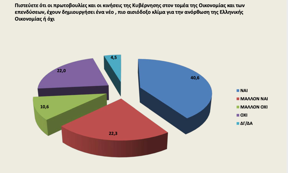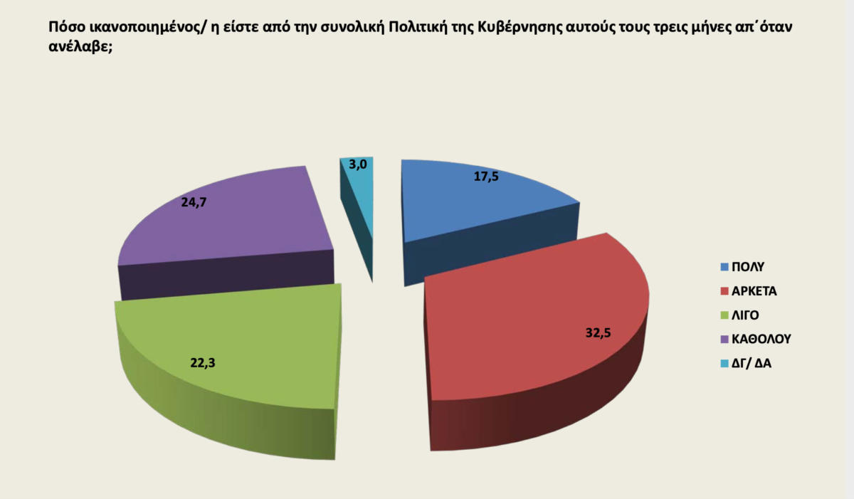 Ικανοποιημένο από τις κινήσεις της κυβέρνησης στην οικονομία δηλώνει το 40,6%. Στη σχετική ερώτηση, «μάλλον ναι» δηλώνει το 22,3%, «μάλλον όχι» το 10,6% και «όχι» το 22%.