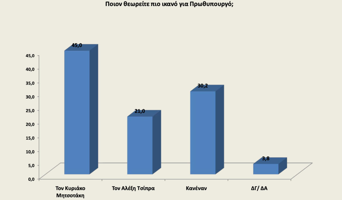 Ο Κυριάκος Μητσοτάκης θεωρείται καταλληλότερος για πρωθυπουργός σε ποσοστό 45%, σε αντίθεση με το 21% που τάσσεται υπέρ του Αλέξη Τσίπρα. «Κανένας» είναι η απάντηση που έδωσε το 30,2%.