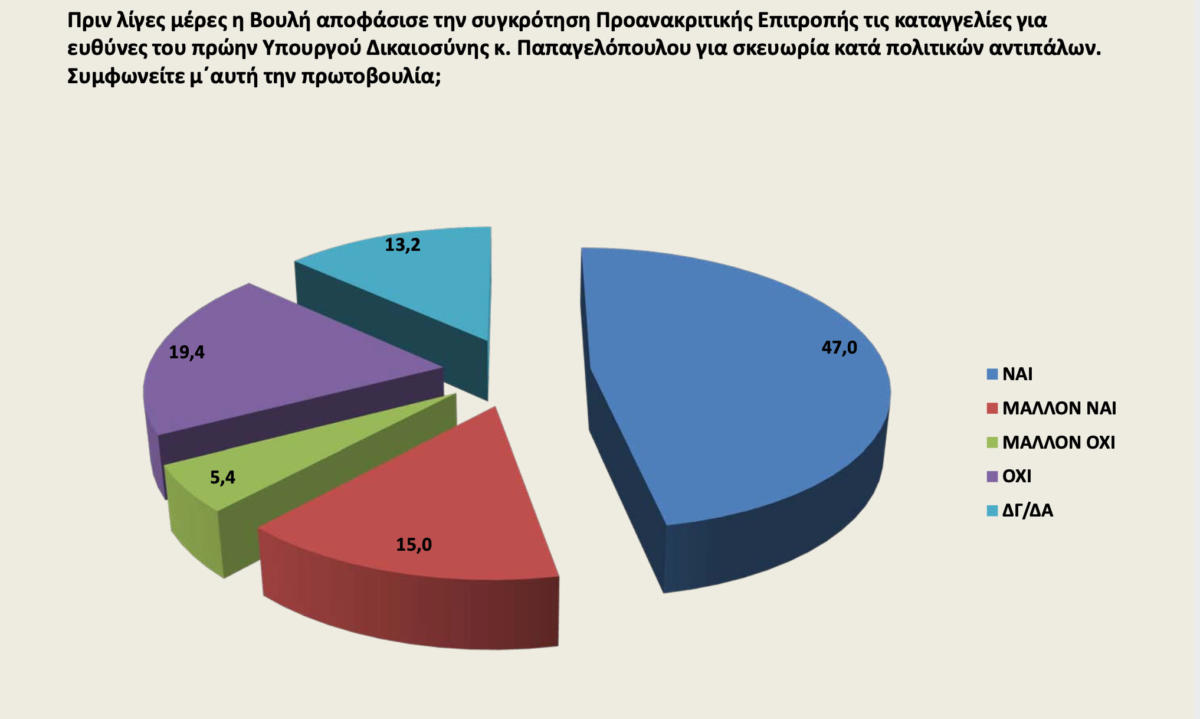 Οι συμμετέχοντες στη δημοσκόπηση τάσσονται υπέρ της σύστασης προανακριτικής επιτροπής για την υπόθεση της Novartis, για την οποία παραπέμπεται ο πρώην αναπληρωτής υπουργός Δικαιοσύνης, Δημήτρης Παπαγγελόπουλος. Το 47% συμφωνεί με την πρωτοβουλία της ΝΔ και το 19,4% διαφωνεί.